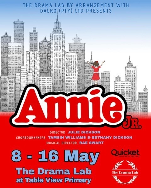 | What: Annie Jr Produced and performed by the Drama Lab When: Friday May 8 to Saturday May 18, 2026 Venue: Table View Primary School, Merriman Road, Table View Tickets: from R165 Bookings: Quicket Direct booking link: https://www.quicket.co.za/events/310487-annie-jr-the-drama-lab#/ Direction: Julie Dickson Choreography: Tamsin Williams and Bethany Dickson Musical director: Raé Swart Costumes: Marna Wright Set: Jacquie Reed Props: Sam Lynch Please note: No children under 4 years |
