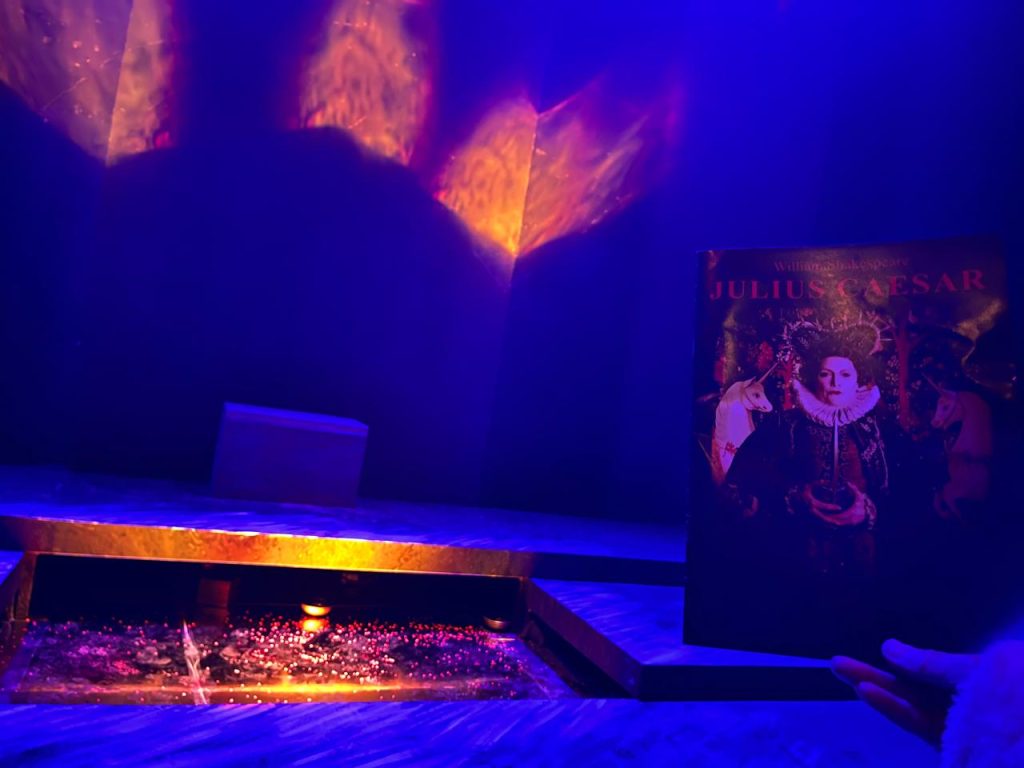 Time and gender is mutable in this adaption. The play is set in three time periods: 1599 (the year Shakespeare wrote the play, against the framework of the Essex Rebellion; 44 BC, the historical setting of Caesar’s assassination and now – 2025.