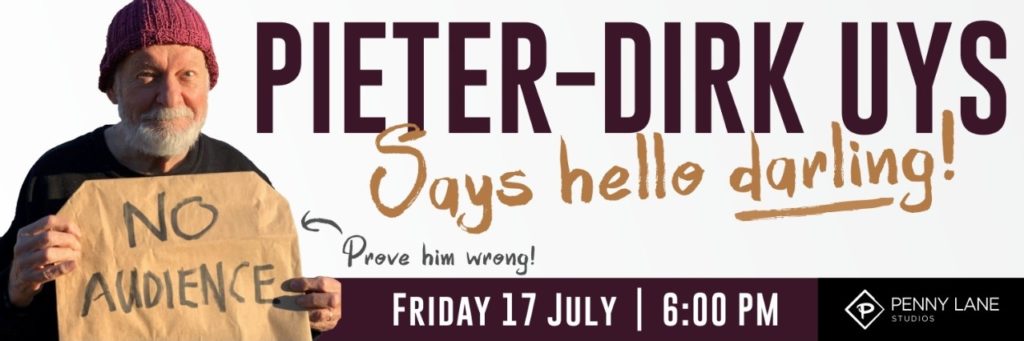 Live stream tickets: Pieter-Dirk Uys says hello darling! – streaming live on July 17, 2020, from Penny Lane Studios in Cape Town “There is no past and there might only be a future far away. It’s all about Now. So my performance is anchored in this moment in all our lives: how do we get through … Continue reading Showtime: Pieter-Dirk Uys says hello darling!